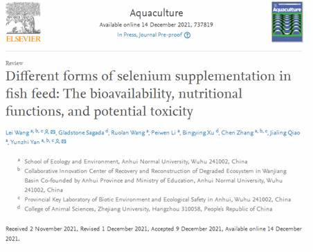 中心青年教师王磊博士在中科院一区Top期刊《Aquaculture》发表题为“Different forms of selenium supplementation in fish feed: The bioavailability, nutritional functions, and potential toxicity”的综述文章。王磊博士为第一作者,严云志教授和王磊博士为共同通讯作者。